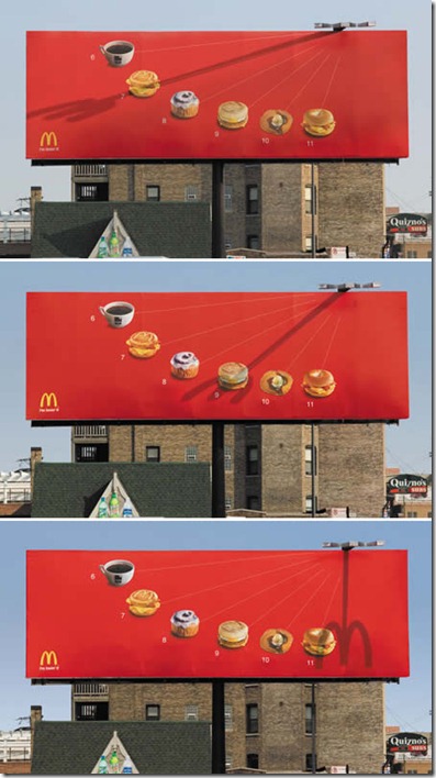 Para anunciar as diferentes opções de café da manhã, o outdoor foi criado como uma espécie de relógio solar, onde a luz solar de acordo com o ângulo do sol, faz com que a cada hora a seta aponte uma opção de comida até o meio dia.