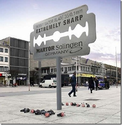 Com o objetivo de mostrar como suas lâminas são afiadas uma empresa criou este outdoor onde sugeria que os pássaros que pousavam em cima dele eram fatiados em duas partes.