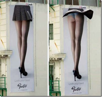 Toda vez que ventava, a saia deste outdoor levantava. O objetivo era anunciar uma loja de lingeries.