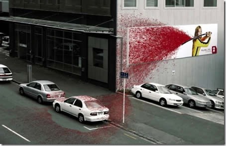 Você achou o filme Kill Bill tão violento que espirrava sangue? Pois foi exatamente o que este outdoor passou ao espirrar sangue na parede, na rua e até mesmo nos carros estacionados.