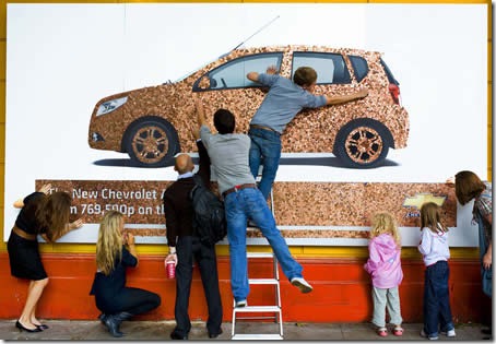 O outdoor acima foi único. Ele utilizava 20 mil moedas de 1 centavo para anunciar que o Chevrolet Aveo custava 769.500 moedas iguais a estas. O que não se esperava era que centenas de passantes levariam apenas meia hora para retirar todas elas.